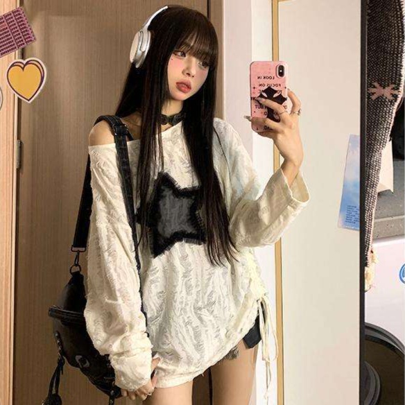 Y2Kファッション必須のスター柄オフショルダートップス
