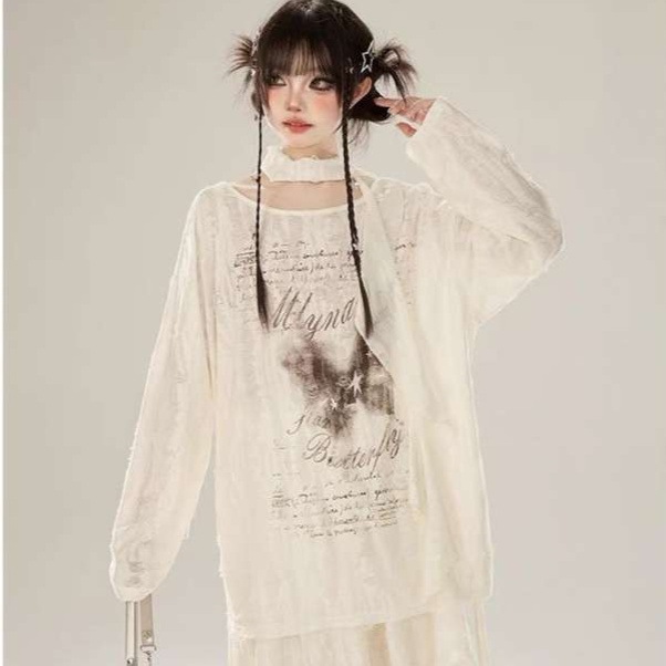 Y2Kファッションのエッセンスを取り入れた、ゆったりシルエットの長袖トップス。首元の繊細なフリルと、胸元の愛らしい蝶々イラストが魅力を引き立てる。長めの裾がロマンティックな印象を与え、シースルー素材が軽やかさを演出。重ね着コーディネートで、個性的なスタイルを楽しめる一着。トレンドを押さえたアイテムで、あなたのファッションに新しい風を吹き込む。
